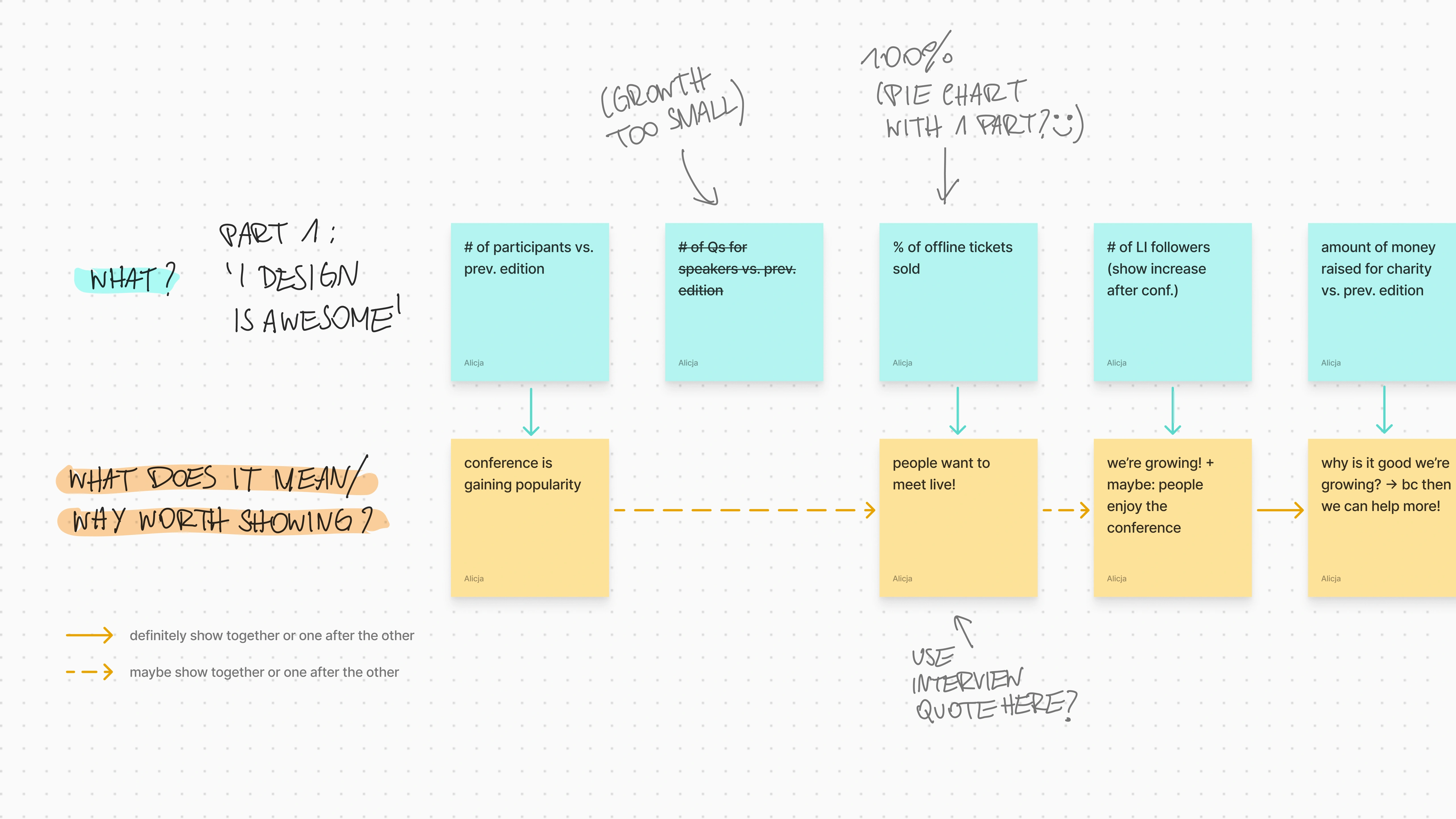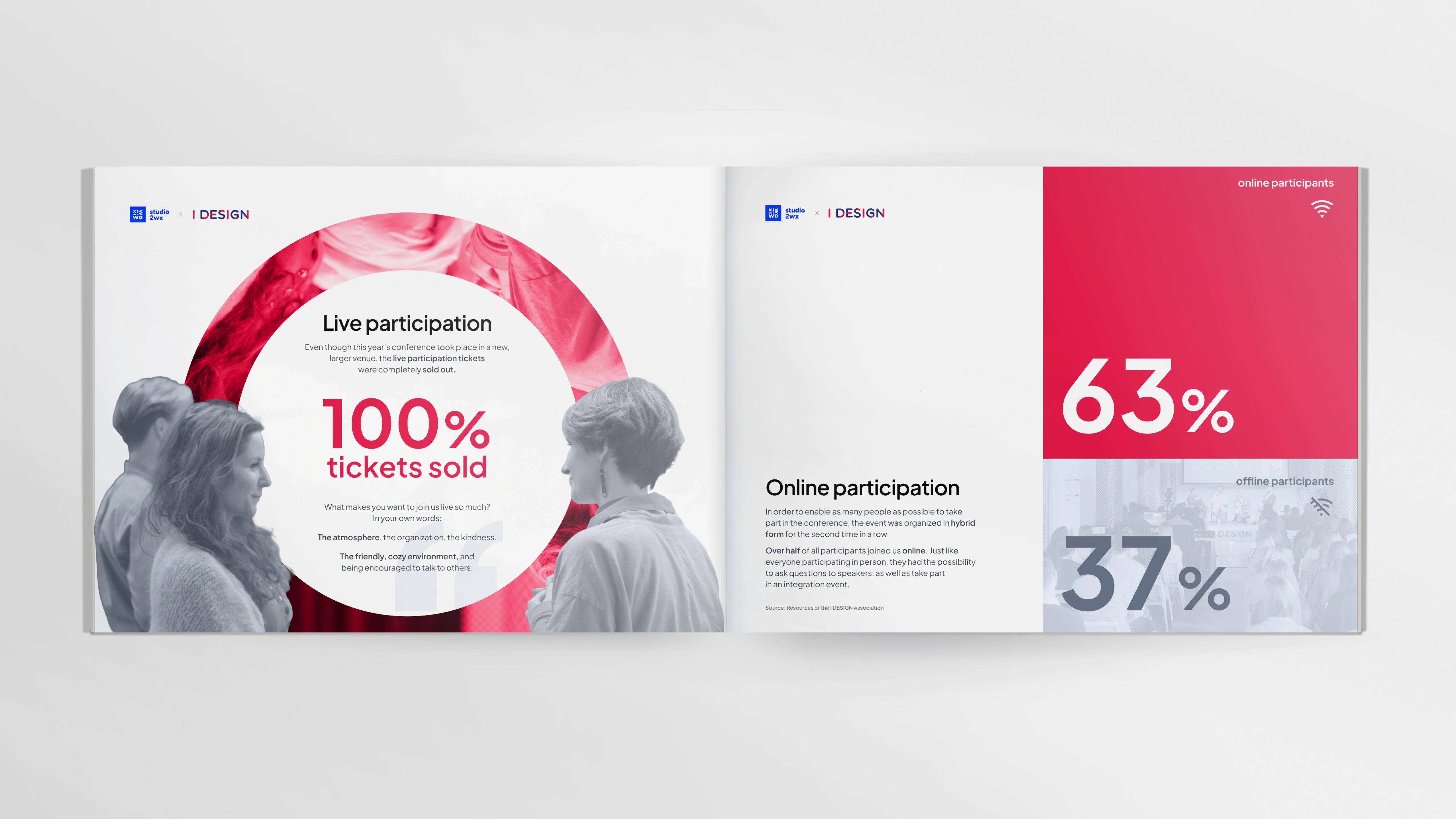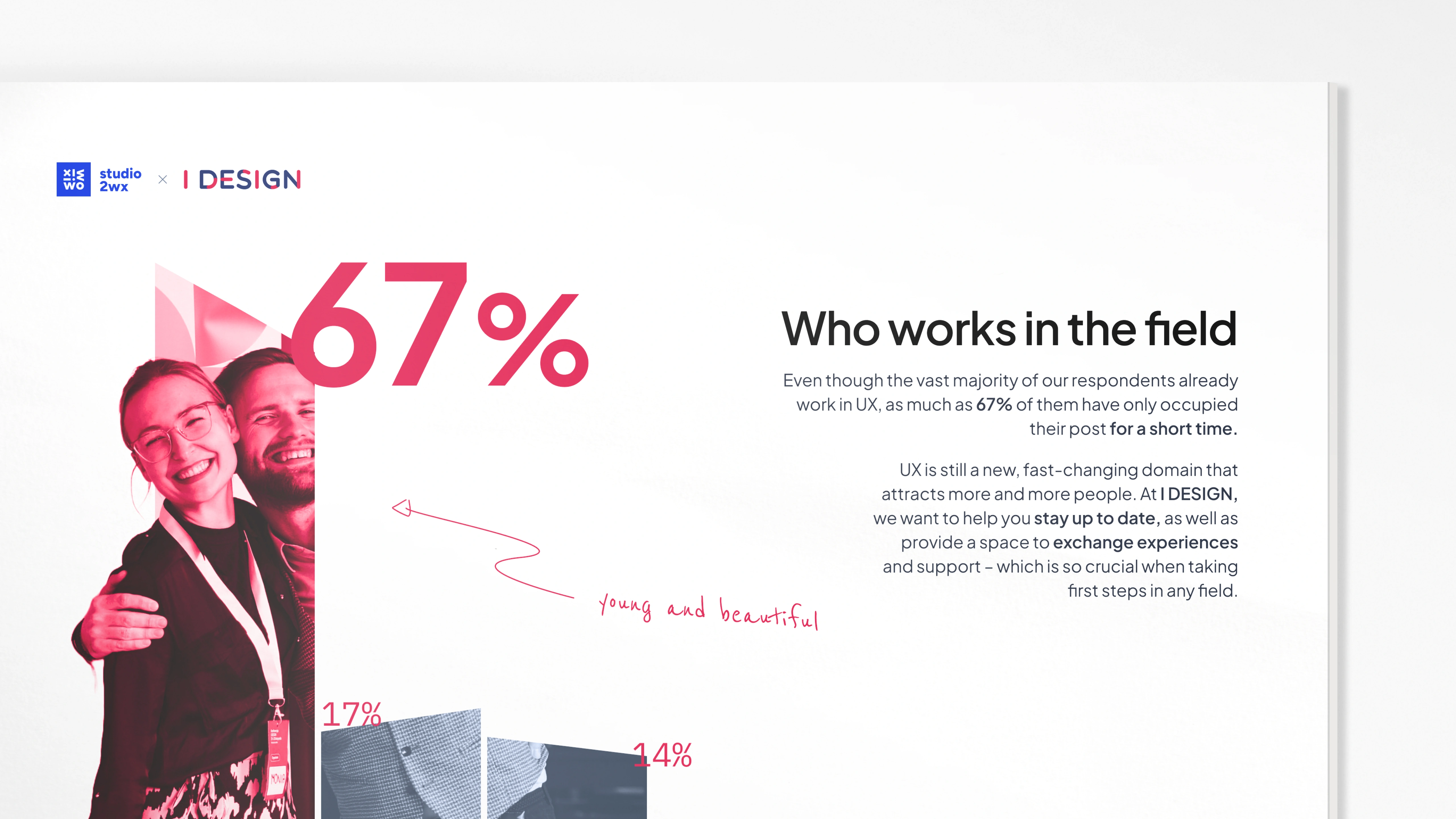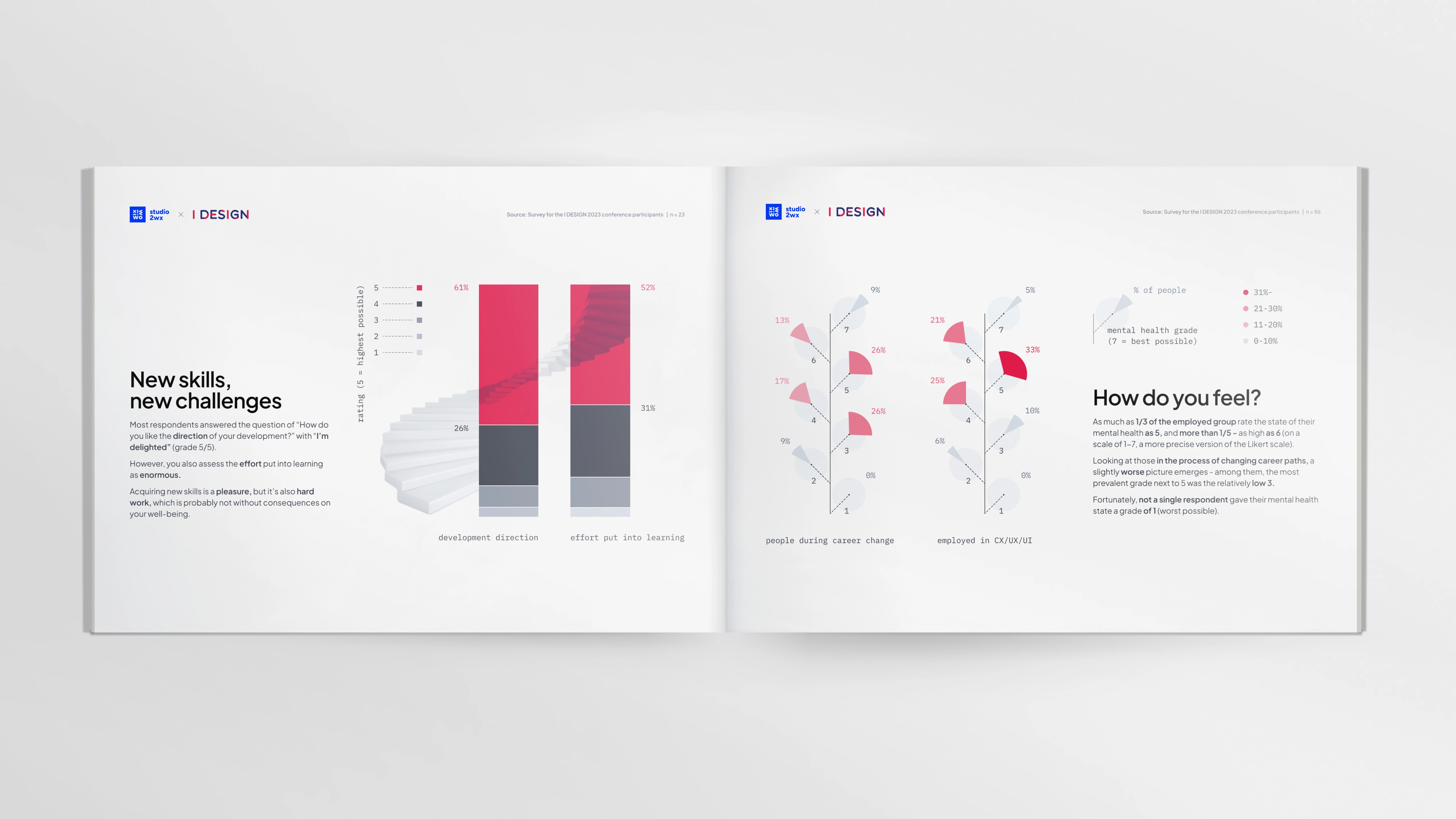 Based on the survey participants’ answers to open questions – which contained, for example, good-humored complaints about uncomfortable chairs – we were able to fine-tune the overall tone of the report, making it calm, but a little playful, with doodles and ‘hand-written’ comments in some places. Along the way, we realized it would also make sense to draw on data from I DESIGN’s social media – to reinforce some of our points, as well as enrich the final product. In its ultimate shape, the report summarizes not only the UX conference, but the entire year 2023 for the I DESIGN society, including its other initiatives and online presence.