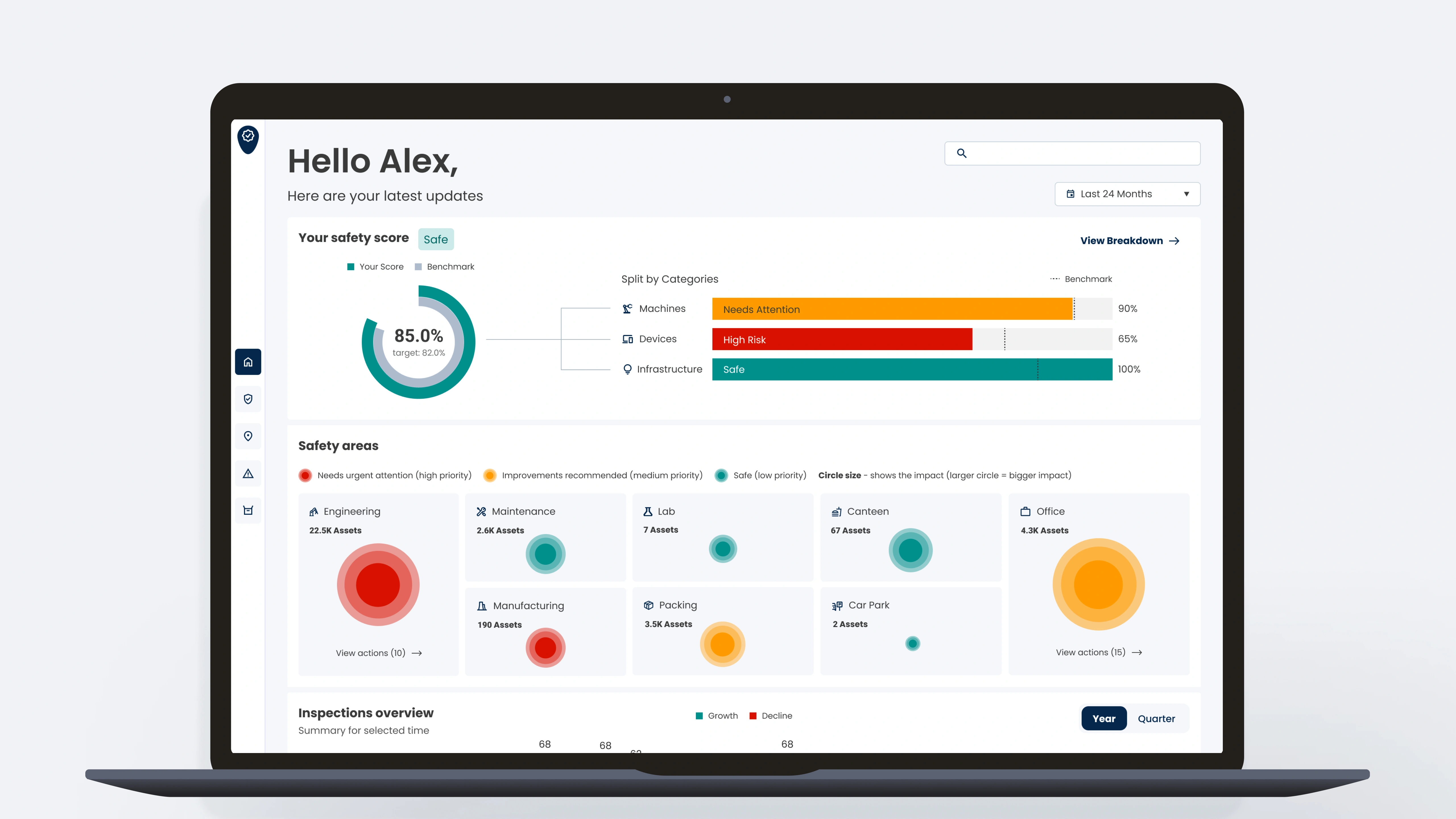 A redesigned home screen for a safety planning tool that tracks safety status and inspections across the company. The previous dashboard was cluttered, making it hard to see what needed attention first. The new design gives leaders a single, clear snapshot of safety checks, overdue actions and upcoming reviews so they can scan the situation at a glance.