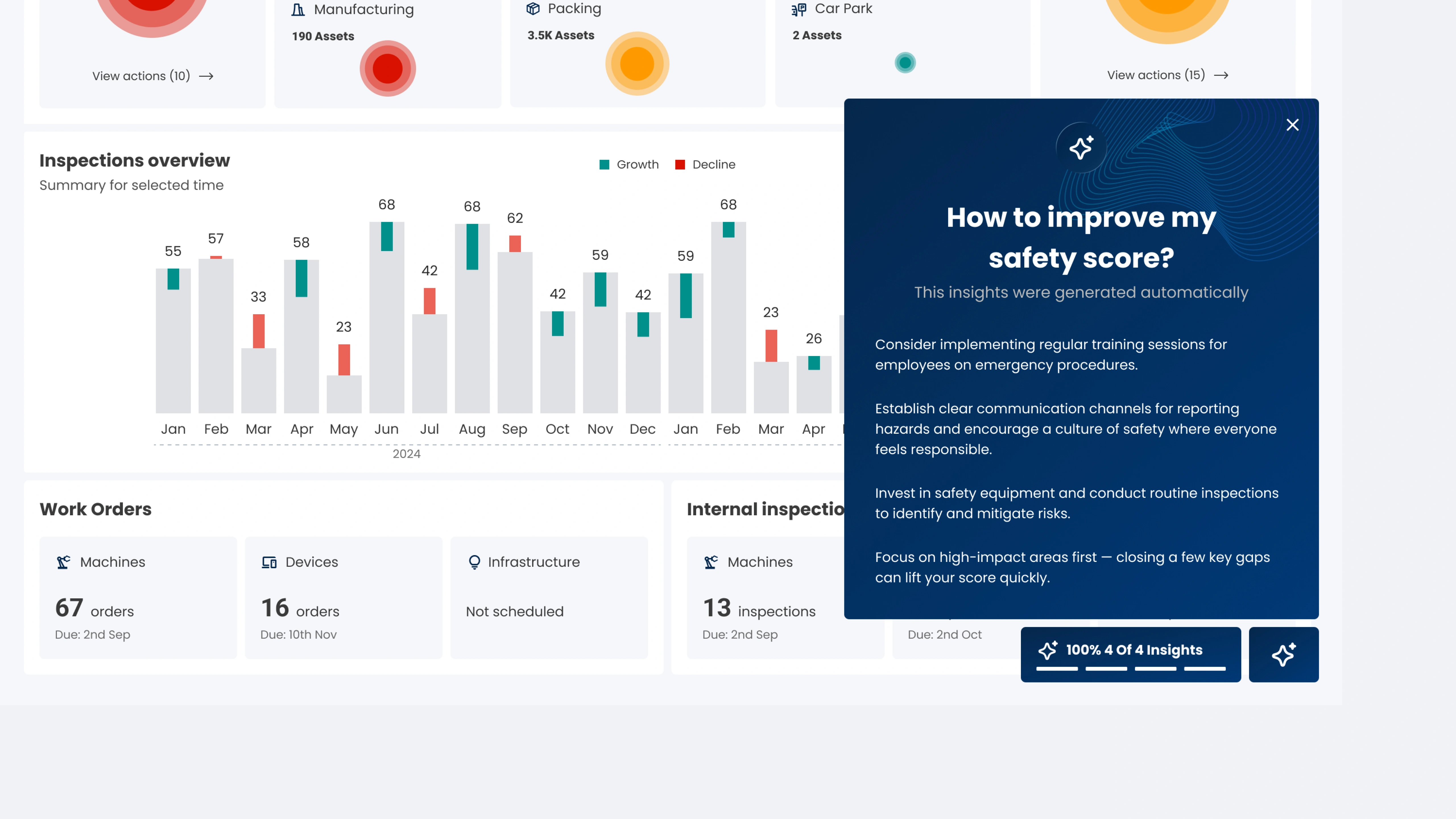 The tool is used by many roles – from HSE coordinators and site managers to central leadership. The new home screen brings together role-based highlights and clear status cards, giving everyone a single view of current risks, upcoming inspections and outstanding follow-ups. Next to this overview, action tiles provide one-click access to planning inspections. An AI insights panel analyses inspection history to surface recurring issues and suggest where to focus next, turning the dashboard into a starting point.