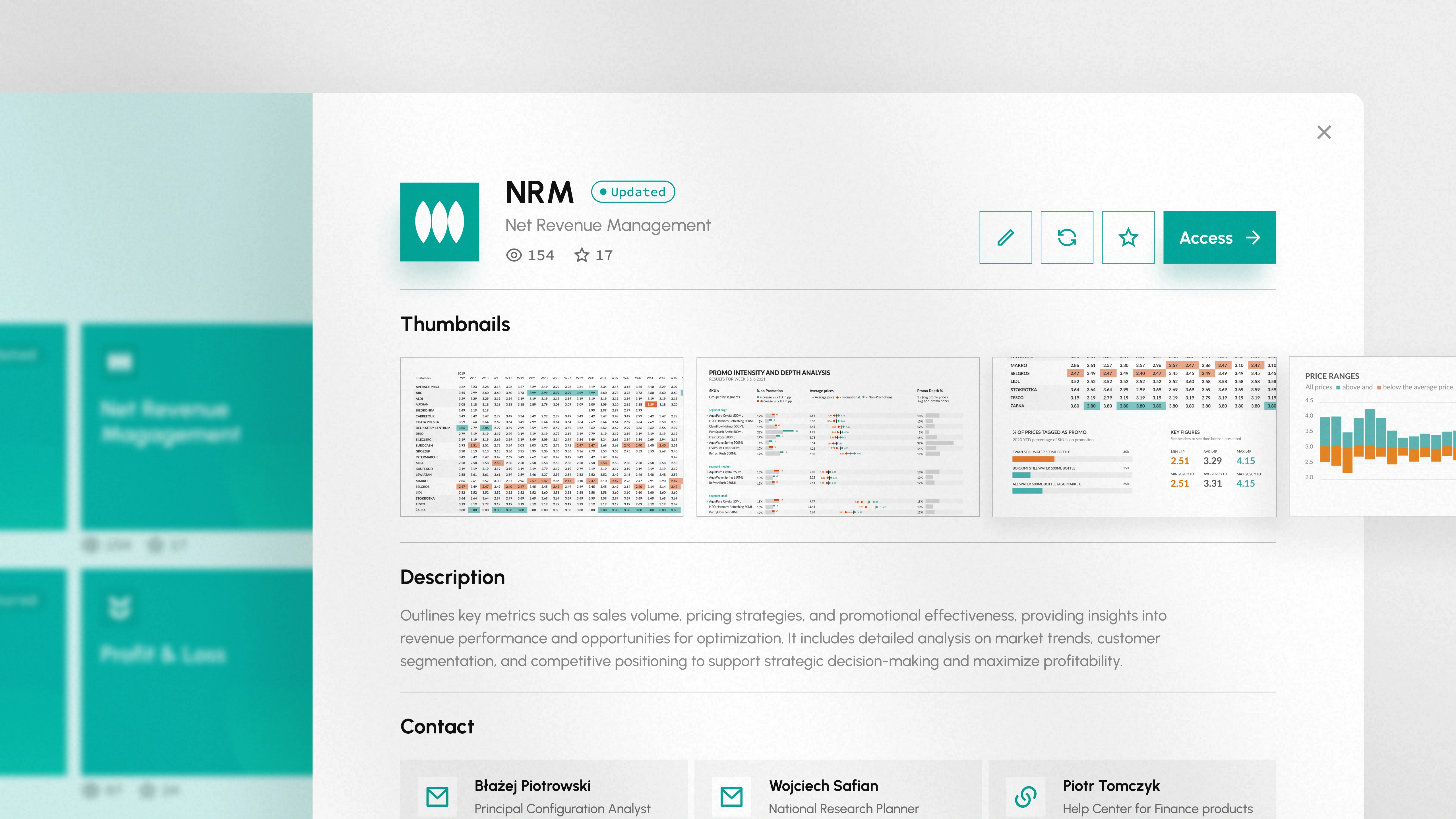 Your team will finally get a platform and tools to make all their awesome analytics products shine in front of the entire company. Mozaika supports creating product pages, properly describing them, linking with related content, and making it easily searchable. Your team will have the chance to organize and classify the content in many ways, providing all required support (guides, contacts, etc.) in a single place.