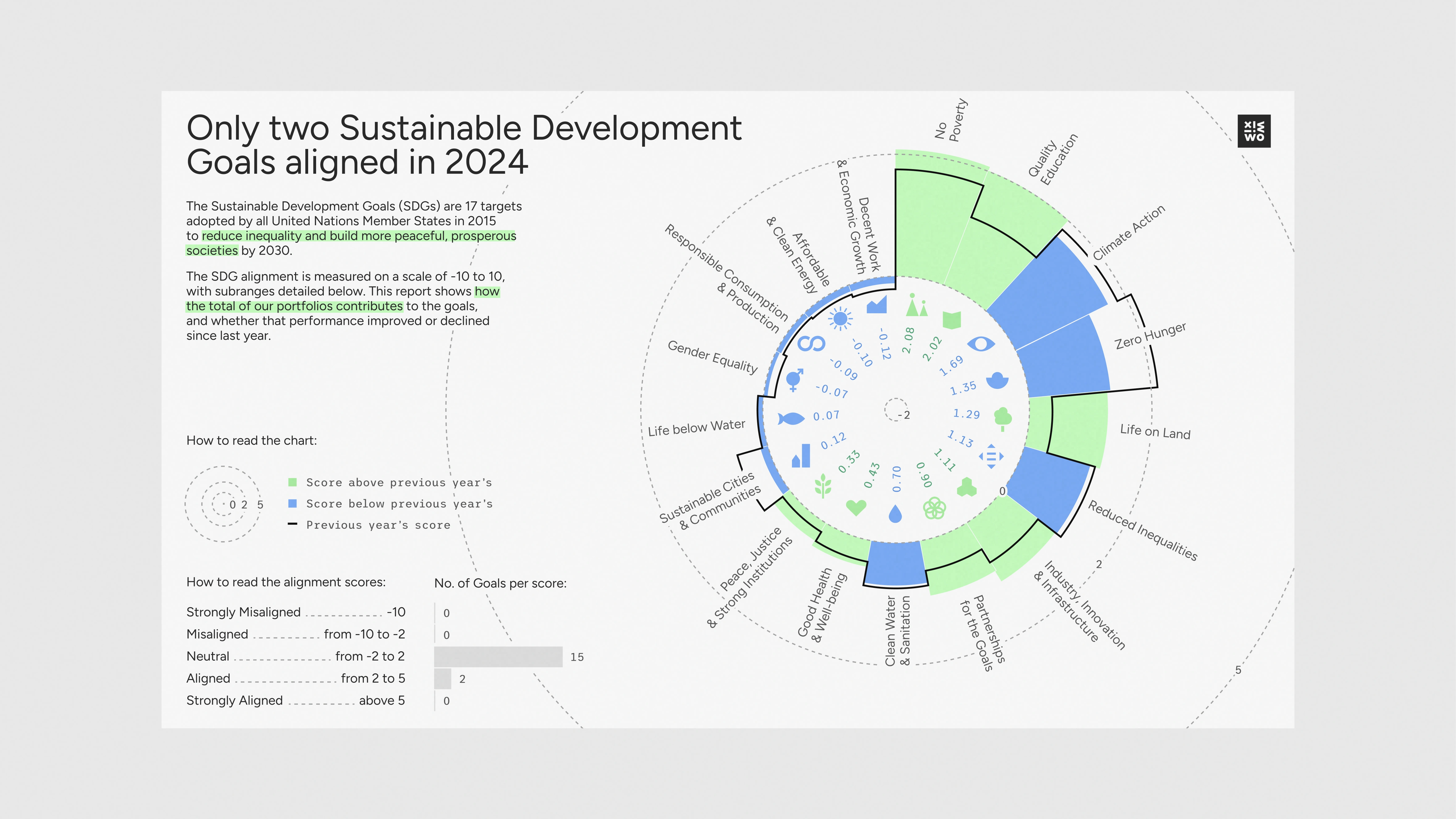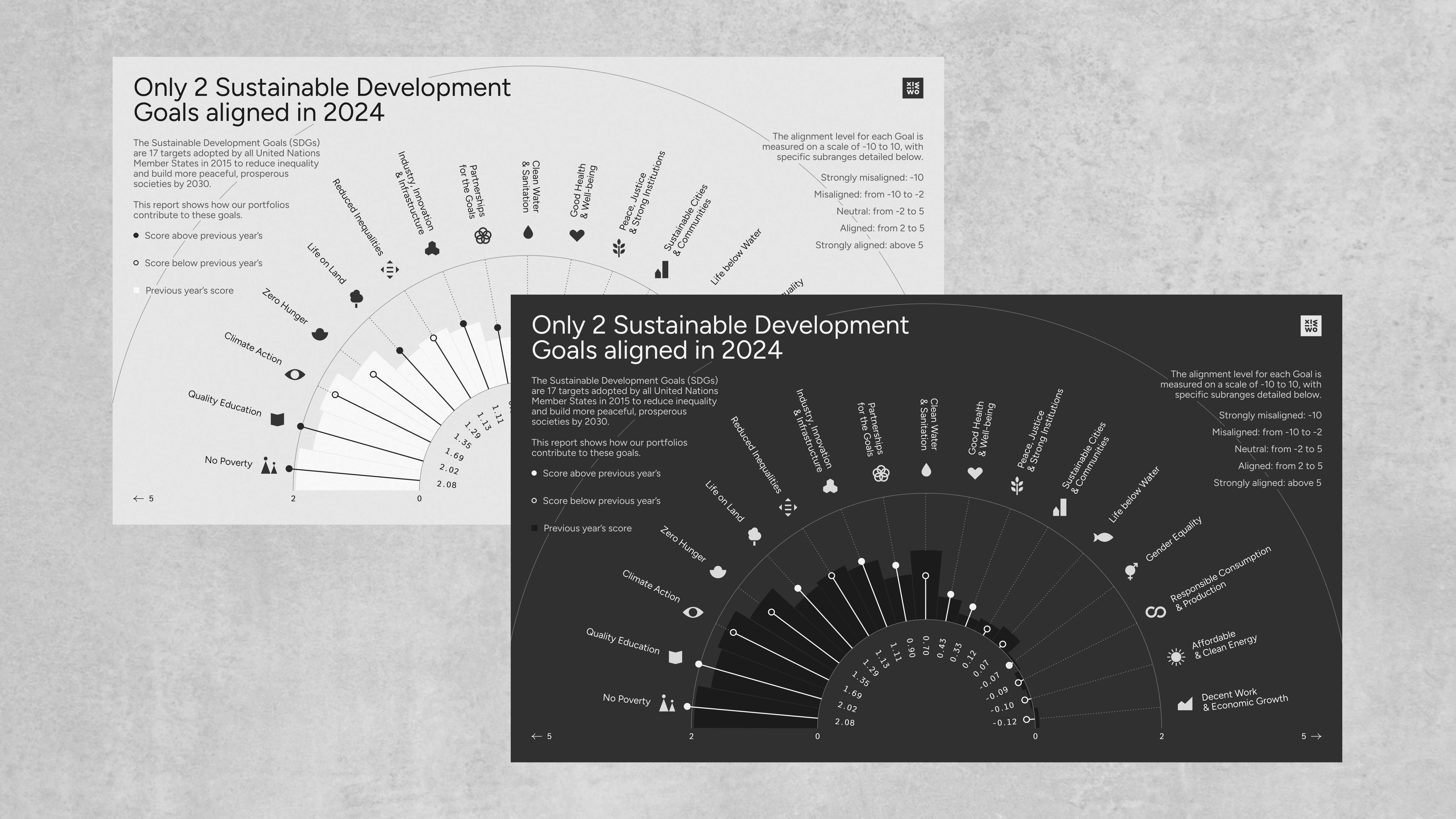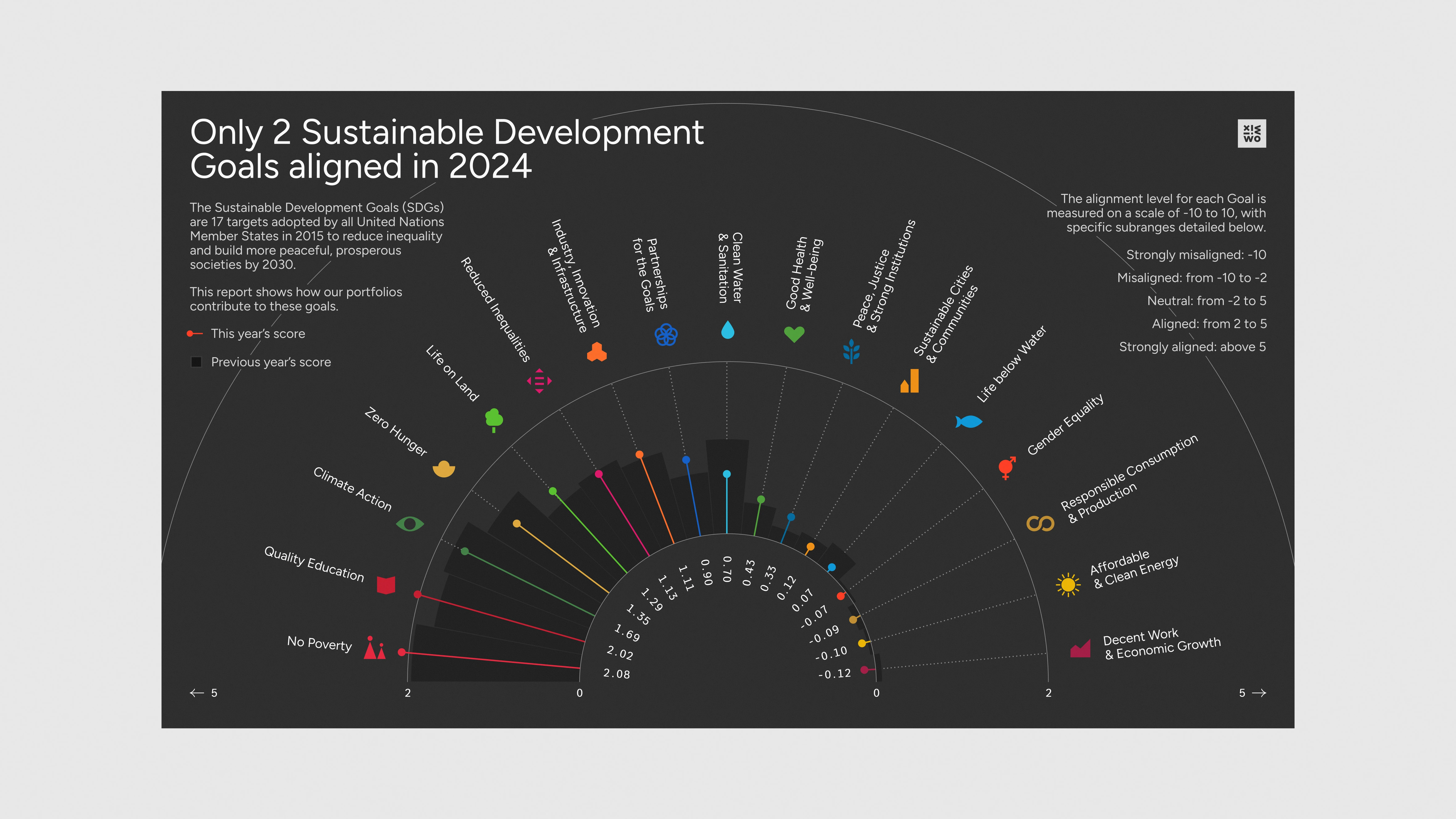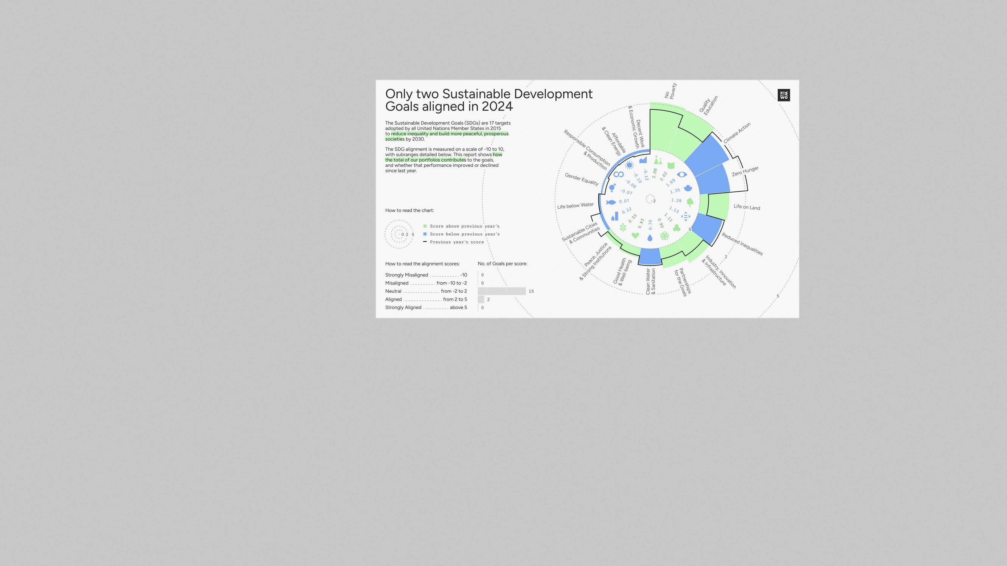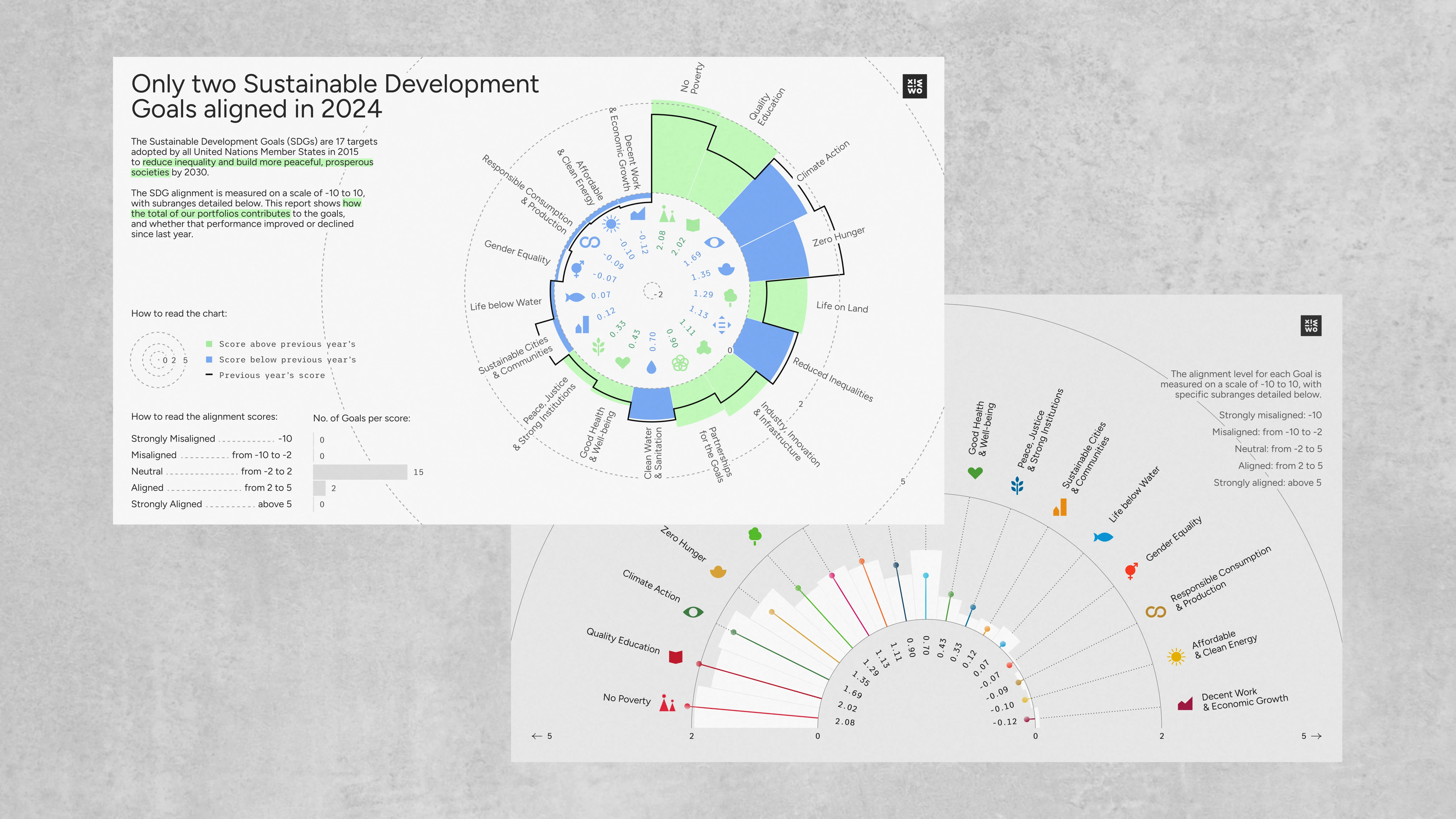 The UN’s Sustainable Development Goals are seventeen interconnected global goals adopted by all UN Member States as a shared blueprint for peace and prosperity by 2030. Working to achieve the Goals means working to end poverty, protect the planet, and ensure well-being for all by balancing economic, social, and environmental needs. Progress towards each Goal can be measured as a score; and the scores fall into buckets from ‘Strongly Misaligned’ to ‘Strongly Aligned’ (the higher the score, the better and more ‘aligned’ it is). Not just countries, but also companies can track their progress towards the Goals – and one such company turned to us for assistance with their internal communication on the subject. We ended up creating a couple of unique pieces as part of the data viz training we were providing.