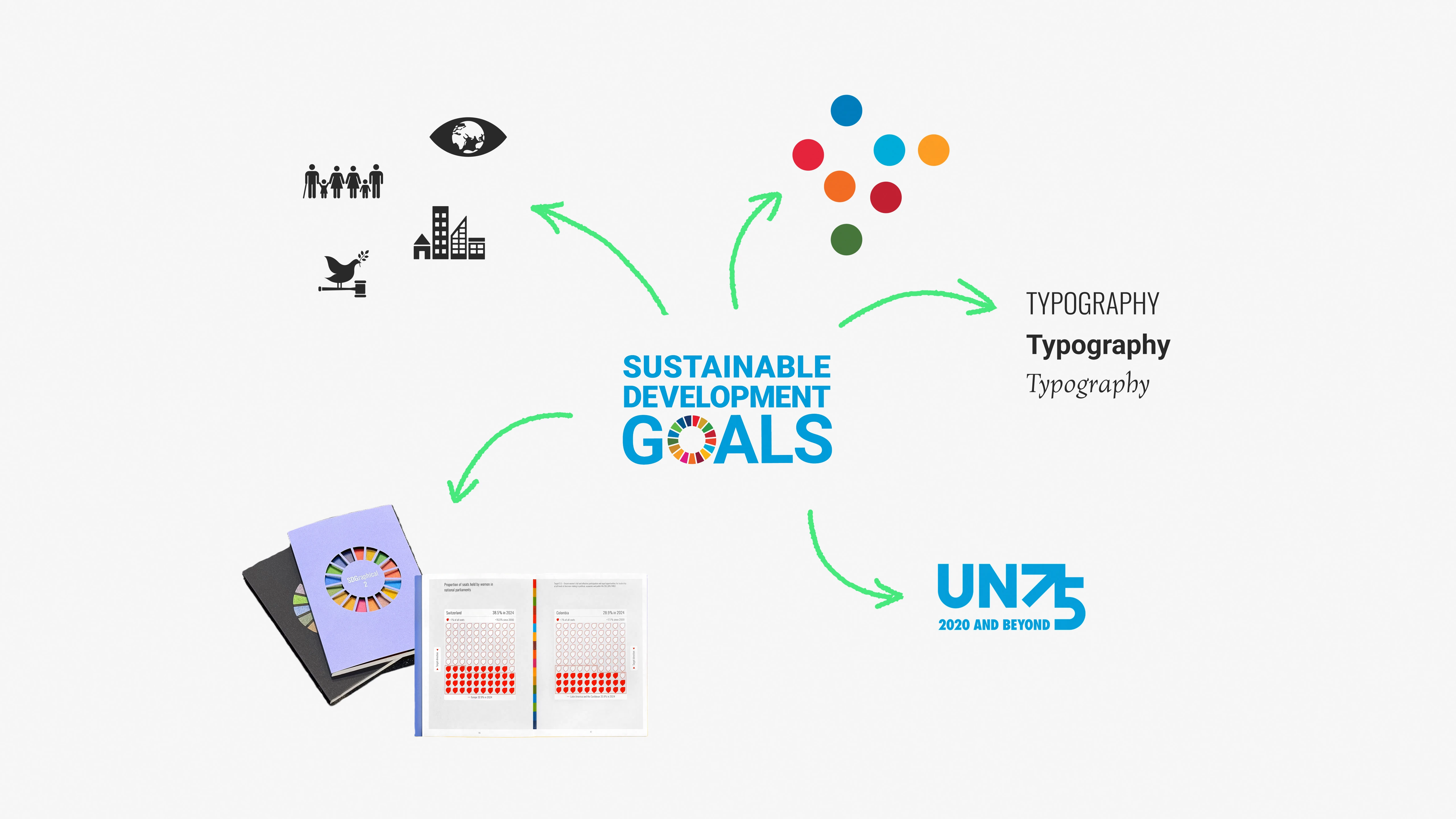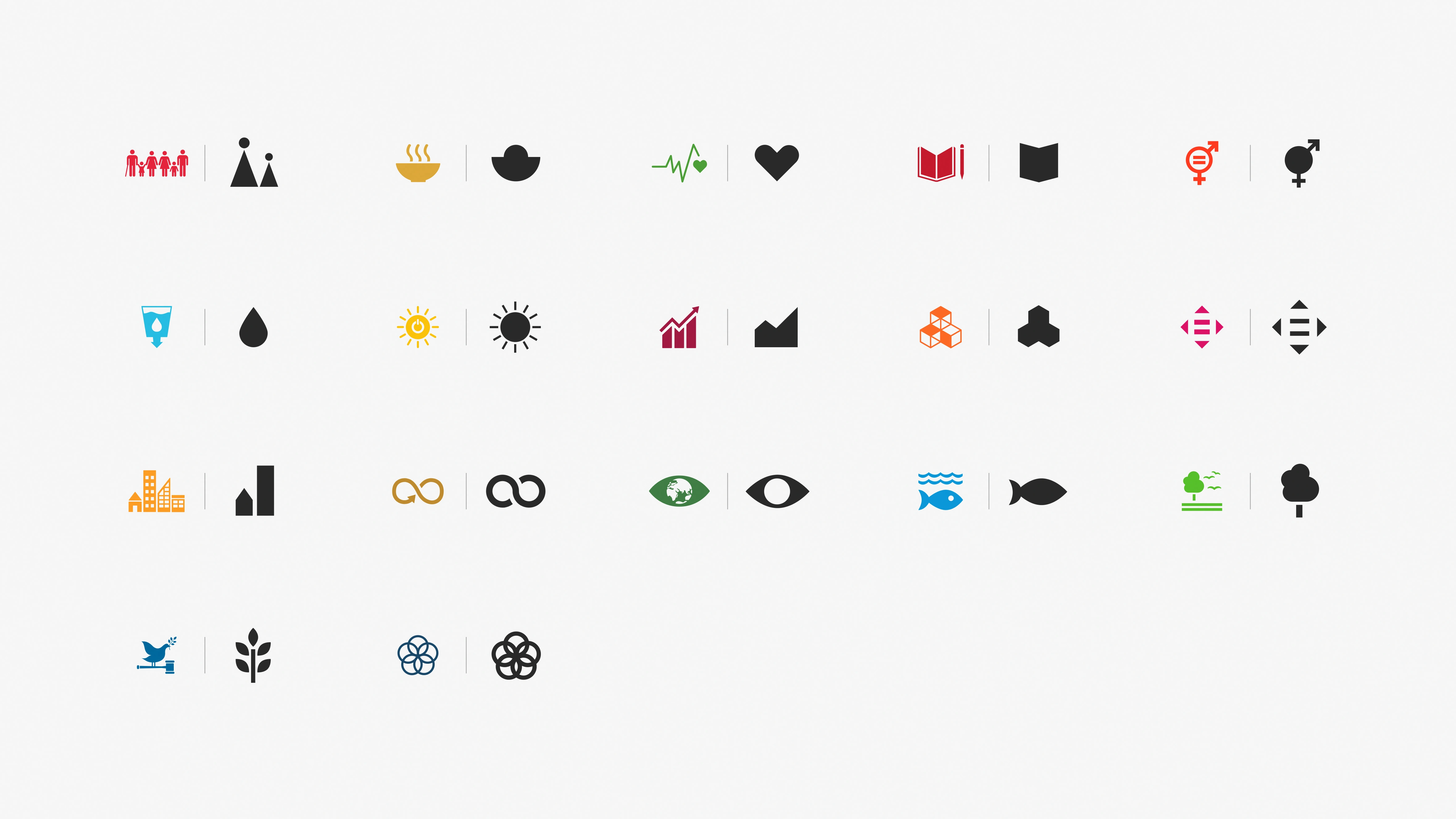 The Sustainable Development Goals have their own branding, distinct from the United Nations. It includes colors, typography, and iconography, and of course, we had to figure out a way of marrying those elements to the visual language of our client (for confidentiality reasons, the client branding has been replaced by our own in the examples shown here).